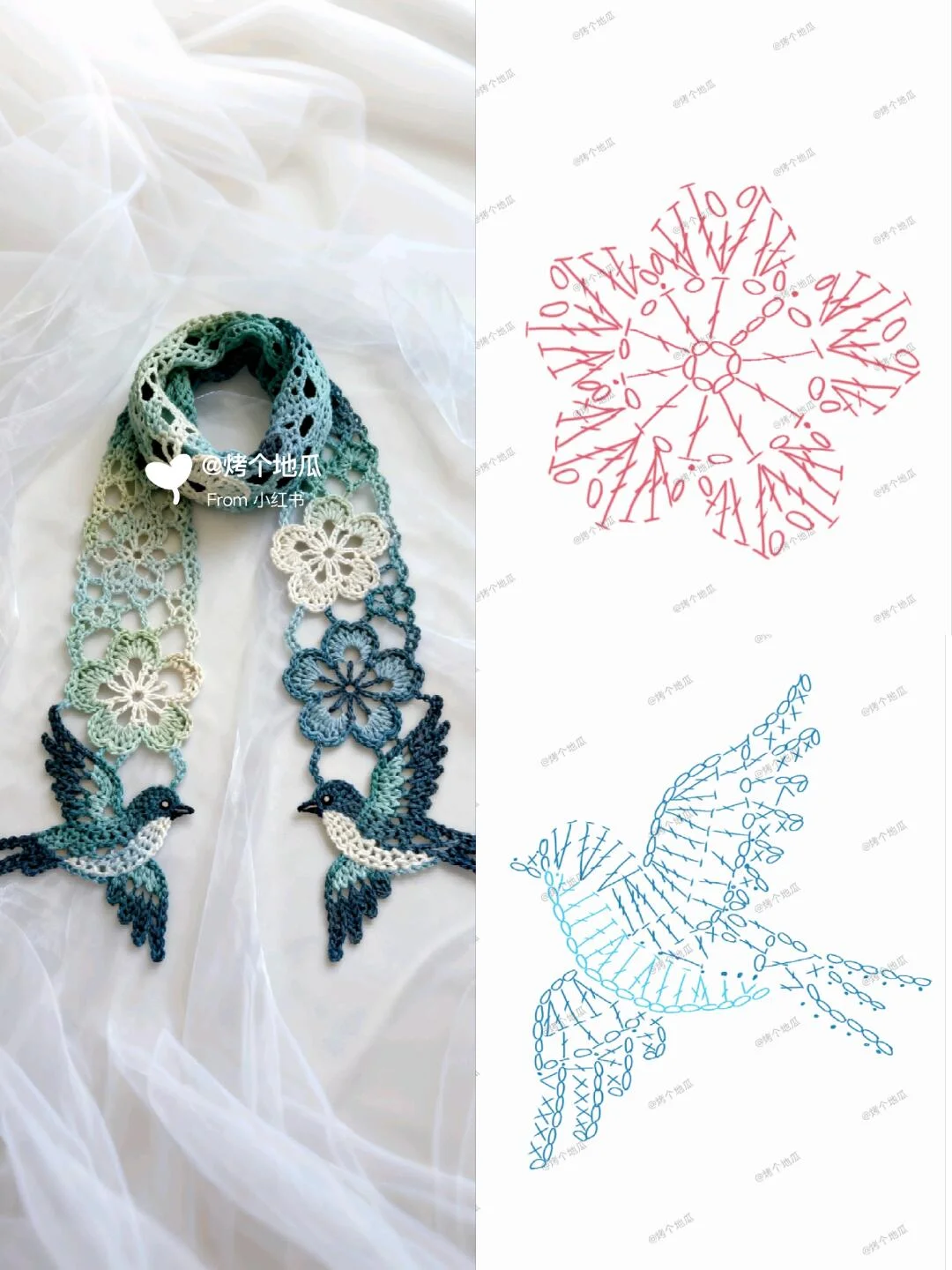 Combined reference image. Flower motifs and bird motifs are crocheted separately, then joined to form the scarf. Multiple flower sizes create a gradient ombre effect.