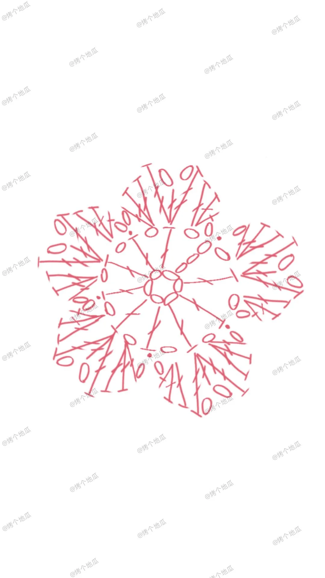 Symbol chart — layered 5-petal flower worked from center outward. Each petal layer is built by crocheting chain loops behind the previous layer. Exact stitch counts should be verified against the symbol chart; the translation above captures the general structure. Part of the flower & bird scarf.