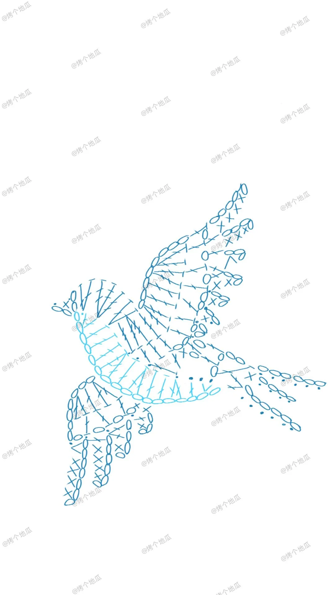 Bird Motif — Symbol Chart (Hummingbird) Freeform crochet bird worked from tail to beak. - Tail: Start with chain, work branching tail feathers using ch and sc - Body: Built with sc and dc stitches in rows/short rows - Wings: Fan-shaped shell stitch groupings (dc clusters) radiating outward - Head & Beak: Sc decreases for shaping, ch for beak This is an artistic freeform piece — follow the symbol chart closely for stitch placement, direction changes, and shaping. Symbols: X = sc, T = dc, o = ch.