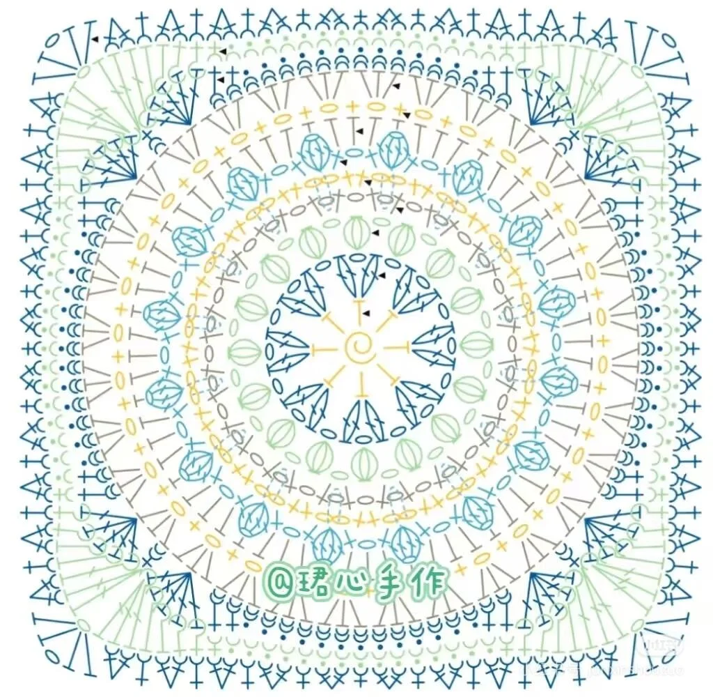 Complex granny square chart; requires symbol reference to read. Color scheme: blue, light blue, yellow, peach (see post images 1–5 for colorway guidance).