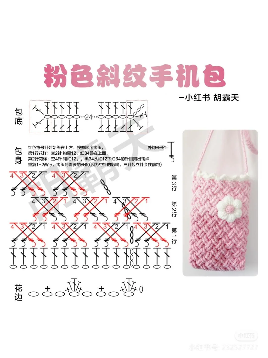 Pink Diagonal Stripe Phone Bag Base (worked in the round along both sides of chain): Ch 34, turn: 30 dc along chain, dc-inc in last ch (corner), 29 dc along other side, dc-inc (corner) = 64 dc total Body (diagonal herringbone/FPdc pattern): Follow the symbol chart for the diagonal stripe pattern using FPdc (Front Post Double Crochet). Row 1 pattern: 32 sts across, pattern repeat of 12 sts Row 2: Same as Row 1 Continue in pattern to desired height. Button Tab: Ch 11, turn: 6 sc back (6) Edging: Follow the scallop/shell border symbol chart along the top edge.