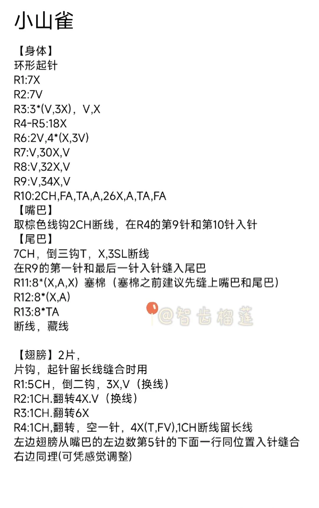 Sparrow (小山雀) — Complete Pattern Key: X=sc, V=sc inc, A=sc dec, T=hdc, F=dc, FA=dc dec, TA=hdc dec, CH=chain BODY (in the round): Rnd 1: 7 sc in MR (7) Rnd 2: sc inc in each st (14) Rnd 3: *sc inc, 3 sc* ×3, sc inc, sc (18) Rnd 4–5: sc in each st (18) Rnd 6: 2 sc inc, 4×(sc, 3 sc inc) — verify stitch count Rnd 7: sc inc, 30 sc, sc inc — verify count Rnd 8: sc inc, 32 sc, sc inc — verify count Rnd 9: sc inc, 34 sc, sc inc — verify count Rnd 10: ch 2, dc dec, 26 sc, sc dec, hdc dec, dc dec BEAK: Using contrasting color, ch 2, fasten off. Insert at Rnd 4 between sts 9 and 10. TAIL: Ch 7, starting from 3rd ch from hook: hdc, sc, sl st ×3. Fasten off. Sew into first and last st of Rnd 9. CLOSING: Rnd 11: *sc, sc dec, sc* ×8 — stuff before this round (attach beak & tail first) Rnd 12: *sc, sc dec* ×8 Rnd 13: hdc dec ×8 Fasten off, weave in ends. WINGS (make 2, flat): Leave long starting tail for sewing. Row 1: Ch 5, sc in 2nd ch from hook, 3 sc, sc inc — change color Row 2: Ch 1, turn, 4 sc, sc inc — change color Row 3: Ch 1, turn, 6 sc Row 4: Ch 1, turn, skip 1 st, 4 sc, (hdc, dc inc) in same st, ch 1 — fasten off leaving long tail Attach left wing: insert at 5 sts left of beak, one row below. Right wing symmetrically.