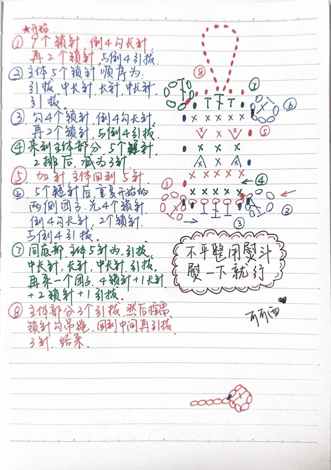 Triomphe Arch Pendant — Handwritten Chart This is a miniature Celine Triomphe arch charm worked in multiple steps: 1. Ch 2, 4 dc (working back), ch 2, sl st back 5 sts 2. Ch 5, work petal: sl st, hdc, dc, hdc, sl st (repeat for 3 rows) 3. Ch 4, sl st back 4 4. At front of row 3: ch 5 5. Work downward with sl st along 3 rows, ch 4, sl st back down 3 rows 6. Inc across 3 rows (building the arch columns) 7. After ch 5, repeat from beginning for second column; both sides return to first st, 4 dc, sl st 8. Same as back: 3 sts, 5 sts sl st, hdc, dc, hdc, sl st; then skip 3, ch 6, sl st 9. 3 sl st at front, ch toward center on both sides, sl st back 3, 3 sts, fasten off. Note: This is handwritten and some details are difficult to read precisely. Refer to the original image for the numbered diagram showing part placement.